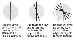 將該直線複製,並向右旋18度。重複這個步驟直至整個圓形都被直線平分。