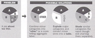利用透視法去繪製的圓形分析圖,可能會令準確性下降。一個圓形分析圖不宜有太多小塊,應適當地將相似的類別合組,使圖表看來更簡單。如其他類別的圖表一樣,清晰的標示是很重要的,這裡不再重複。