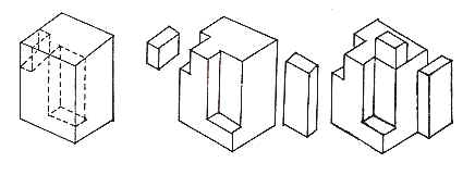 塊材是相對狀的體。塊材包括實心塊體與空心塊體。其中空心塊體包括中心鏤空的塊體和由面材包被成的空心塊體。它們均是一個封閉的形體, 與界外空間有明顯的區別, 有重量感﹑穩定感和抗外界壓力的拙實感。塊材力度感強, 是最具立體感﹑空間感和量感的實體。我們要充分地利用其語言特性, 才能表現作品的內涵。