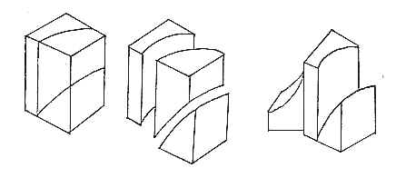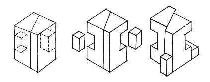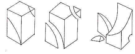 塊的分割是研究被分割形體與整體造型之間的關係。日常生活中, 常見的用線切割皮蛋, 切斷后在立體的切口處產生新的面, 同一個立體, 斷面的形狀也往往根據切線的位置﹑角度和線型的變化而變化。的線型分割大體可分為: 直線分割法﹑曲線分割法和綜合分割法三種形式。在進行分割之前, 先應考慮下面幾個問題: (1)構成的形態。(2)選用的分割線型。(3)分割的部位﹑角度。(4) 分割下的形體與主體的組合形式。分割和組合是可以相互聯合使用的, 由分割的形式進行重組合成新的立體形態, 組合時應注意各部份的大小方向及位置等變化形式。