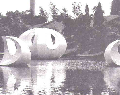 不同單體的積聚可以是由不同大小的單體組合, 不同形單體的組合。自由形體的積聚還須特別注意實體與空間的關係。空間位置上的變化, 追求總體上諧調﹑均衡的效果。